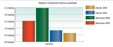 W 2003 roku zawartość strontu w pierzdze w regionie warszawskim wyniosła 1,52 mg/kg, w tym samym roku w regionie Olecka była niższa i wynosiła 0,83 mg/kg. W 2004 roku zawartość tego pierwiastka w regionie warszawskim w porównaniu do 2003 roku wzrosła do 2,45 mg/kg, a w regionie suwalskim w stosunku do 2003 roku zmalała do 0,63 mg/kg.