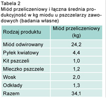 Wydawać by się mogło zatem, że taka grupa pszczelarzy jak pszczelarze zawodowi powinni wyraźnie przekroczyć średnią produkcję miodu szacowaną dla terenu Polski. Z ankiet wykonanych wśród tej grupy wynika, ze pszczelarze odwirowali ok. 24 kg miodu z rodziny pszczelej (tab. 2).