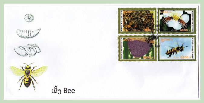 Pszczoły na plastrze, pszczoły na kwiatku, rój i lecąca pszczoła to tematy serii znaczków wydanych w 2008 r. przez pocztę Laosu. Wymienioną serię „pszczelich” znaczków prezentujemy na kopercie z pierwszego dnia obiegu (FDC) z ozdobnym stemplem – lecącą pszczółką.