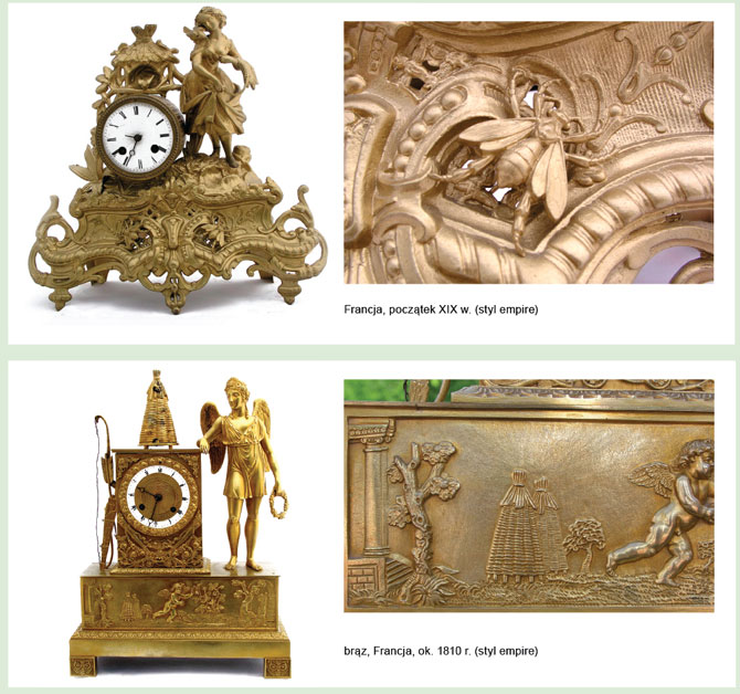 Ule, pszczoły i kószki występują w kolejnym dziale naszej kolekcji, tj. zegarów. Prezentujemy zegary wykonane w brązie, porcelanie i rzeźbione w drewnie, pochodzące z początku XIX i XX w.