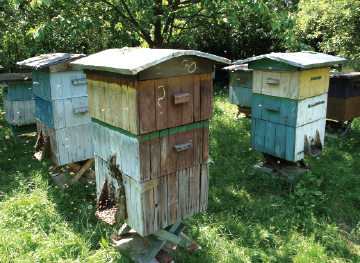 Fot. 3. Fragment pasieki Autora artykułu z „ulami-wieżowcami” na pierwszym planie.