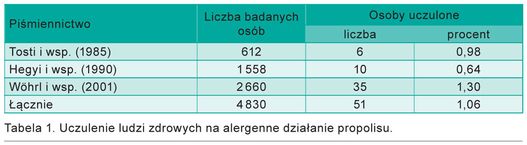 Badania przeprowadzone na dużej liczbie zdrowych ludzi wskazują, że ich wrażliwość na alergenne działanie propolisu mieści się w granicach 1% (tab. 1.). Oznacza to, że tylko 1 osoba na 100 zdrowych pozytywnie reaguje na propolis, w wyniku czego powstaje u niej odczyn alergiczny na tę substancję.