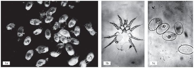 osobnik dorosły – samica (1b); jaja roztoczy w różnych stadiach rozwoju embrionalnego (1c).