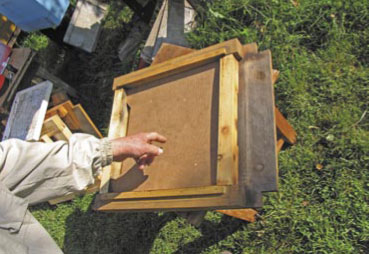 Poza tym można zamiast szufladki na początku grudnia wsunąć wkładkę z pilśni twardej o grubości 3 x 370 x 370 mm, z podbitymi dwoma listwami drewnianymi 16 x 16 cm opierającymi się na dennicy. Koledzy, którzy odwiedzili pasiekę pana Czesława Junga, na pewno widzieli to rozwiązanie.