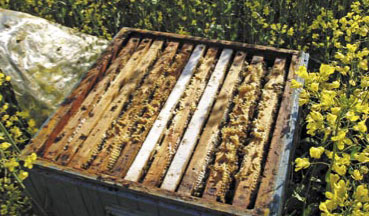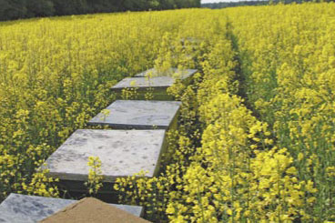 Fot.4. Ustawienie pasieki w rzepaku jest korzystne. Koniec kwitnienia utrudnia trochę loty pszczołom, gdyż rzepak jest wyrośnięty, ale rekompensuje to bliskość wziątku
