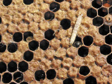 Zaraz po wykluciu młode gąsienice rozpoczynają żerowanie na plastrach. Jego początek ma miejsce na wolnej krawędzi komórki plastra w postaci charakterystycznego „wybielonego kołnierzyka”. Widoczny jest także jasny pasek biegnący w głąb komórki – ślad, że gąsienica zeszła już na jej dno.