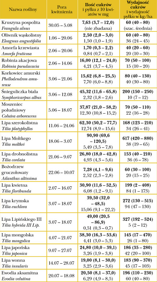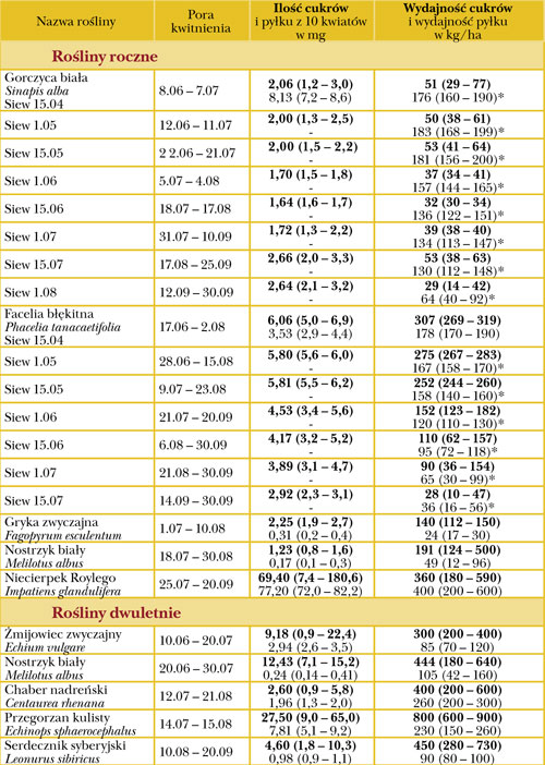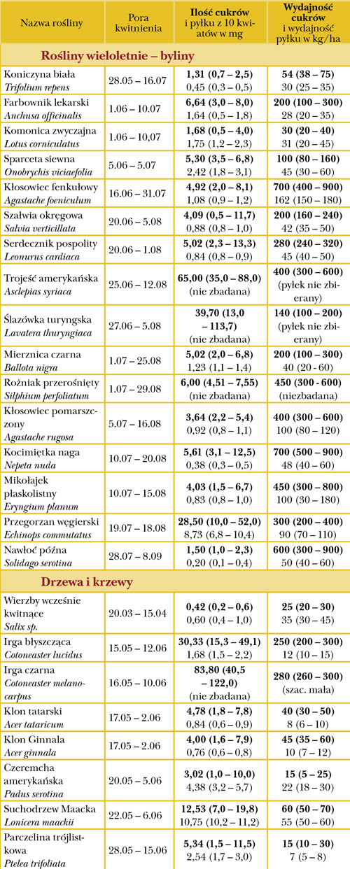 W załączonej tabeli zestawiono około 40 gatunków, które – jak się wydaje – najlepiej nadają się do poprawy pożytków. Rośliny te uszeregowano w tabeli grupami (roczne, dwuletnie, byliny oraz drzewa i krzewy) i według kolejności pory ich kwitnienia jako cechy kierunkowej.