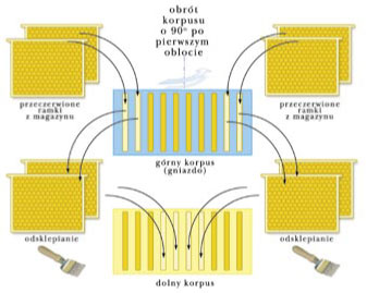 Omówienie zasad gospodarki rotacyjnej – regularnej wymiany plastrów i matek, zwiększonej pracy w sezonie – jako sposobu na zdrowsze, silniejsze rodziny lepiej wykorzystujące pożytki i dające stabilniejsze zbiory miodu.