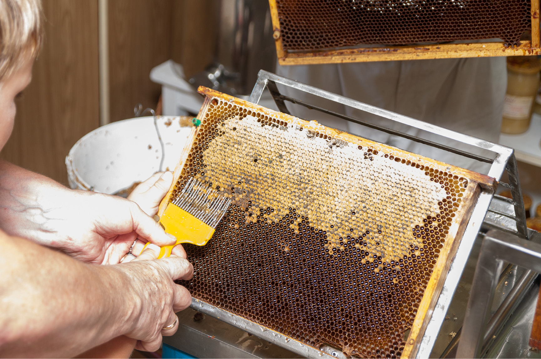 Po przyniesieniu ramek do pracowni pszczelarskiej, przystępuje się do odsklepiania. Za pomocą odsklepiacza widelcowego lub noża (zwykłego, elektrycznego albo parowego) usuwa się woskowy zasklep z komórek zawierających miód. To kluczowy etap przygotowujący plastry do odwirowania. Przyda nam się również wanienka do odsklepiania - służy do oparcia ramki z miodem podczas odsklepiania. Do wanienki spływa miód wyciekający z plastra, a na sicie gromadzone są odsklepiny. Tak odsklepione i przygotowane ramki trafiają wprost do kosza miodarki.