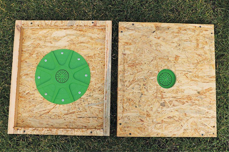 De asemenea, puteți economisi timpul și munca în modul în care colectați mierea din stupi. Am decis să folosesc dispozitive care permit doar iesirea albinelor (izgonitoare de albine) cu opt orificii. Le-am așezat pe plăci cu un singur orificiu cu diametrul de 90 mm în partea centrală realizată cu un ferăstrău standard pentru lemn (foto 2.). Aceste panouri au fost echipate cu un cadru înalt de 20 mm din partea inferioară, care le distanțează de cadrele pe care se deplasează insectele. Datorită acestei construcții, dispozitivul izgonitor de albine se încadrează fără probleme deasupra ramelor corpului direct sub ea (sub placa în care este fixată), iar albinele nu sunt zdrobite la aplicarea acesteia.