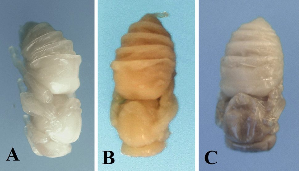Fotografie 2. Pupele moarte A) aspect aproape normal, B) îngălbenite, C) corpul din față întunecat. Fotografie G. Topolska